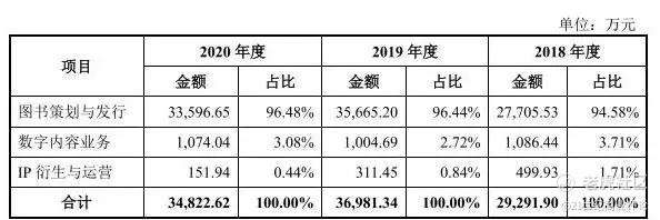 2018年至2020年,果麦文化的图书策划与发行项目收入占总收入比例较大,位于94.58%至96.48%;数字内容业务项目和IP衍生运营项目收入占比较小,分别约为3%和1%。