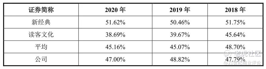 三大公司的主营业务毛利率均值差异较小。据招股书,2018-2020年,果麦文化图书策划与发行业务的毛利率分别为47.79%、48.82%、47%;新经典相关业务的毛利率分别为51.75%、50.46%、51.62%,读客文化图书策划与发行业务毛利率为45.64%、39.67%、38.69%。