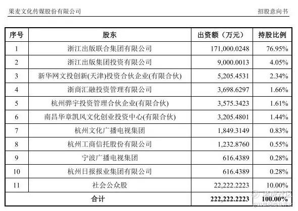 果麦文化主要股东为浙江出版联合集团、浙江出版集团投资有限公司、新华网文投创新、浙商汇融投资管理有限公司等。其中,浙江出版联合集团持股76.95%,浙江出版集团投资有限公司持股4.05%,新华网文投创新持股2.34%。