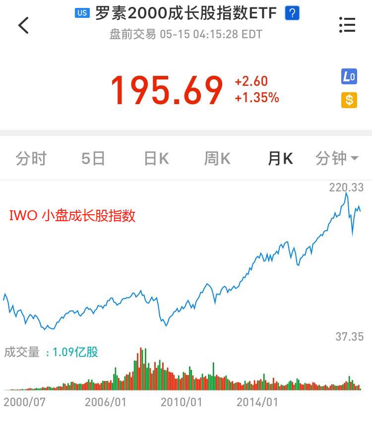 ($(IWO)$) 美国小盘成长-iShares,iShares旗下的追踪罗素2000成长股指数ETF,该ETF价格与罗素2000成长股指数波动方向相同,波动幅度约等于罗素2000成长股指数,即罗素2000成长股指数上涨1%对应该ETF指数上涨约1%。目前约为90亿元规模。