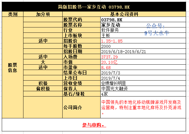 中国棋牌游戏开发商及运营商家乡互动招股,拟发行3.14亿股,当中10%作公开发售,90%为国际配售,另有6.2%超额配股权,集资规模约4.24亿元至5.81亿元,将于2019年7月4日发行。