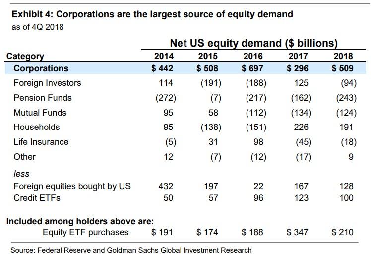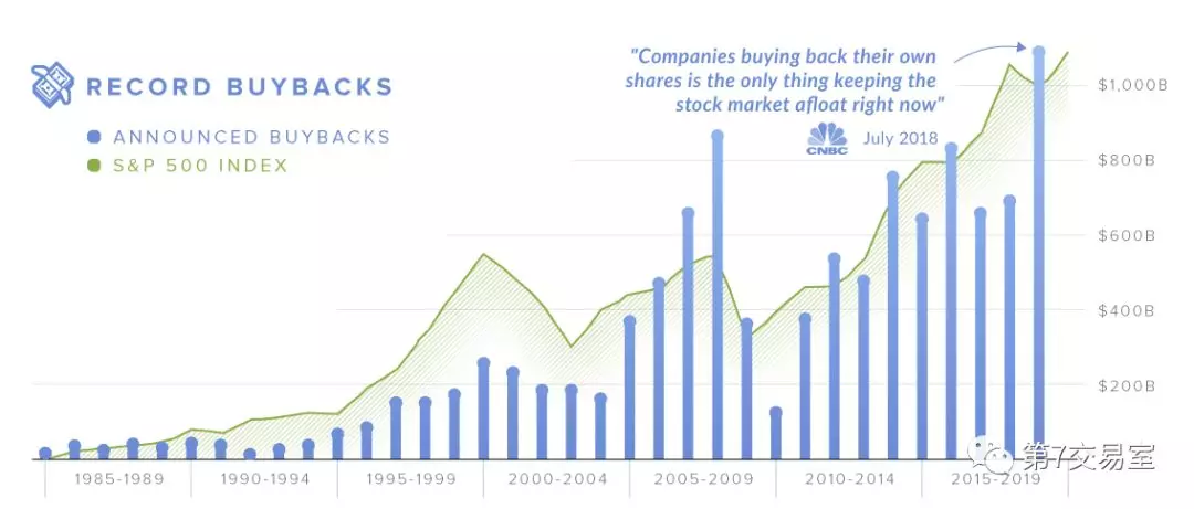 高盛统计出,截至2018年的第四季度,股票买入需求量最高的,从来都是美国企业,企业对股票的需求远远超过了其他所有投资者类别的需求总和。过去9年,美国所有股票的净回购额平均每年为4200亿美元。