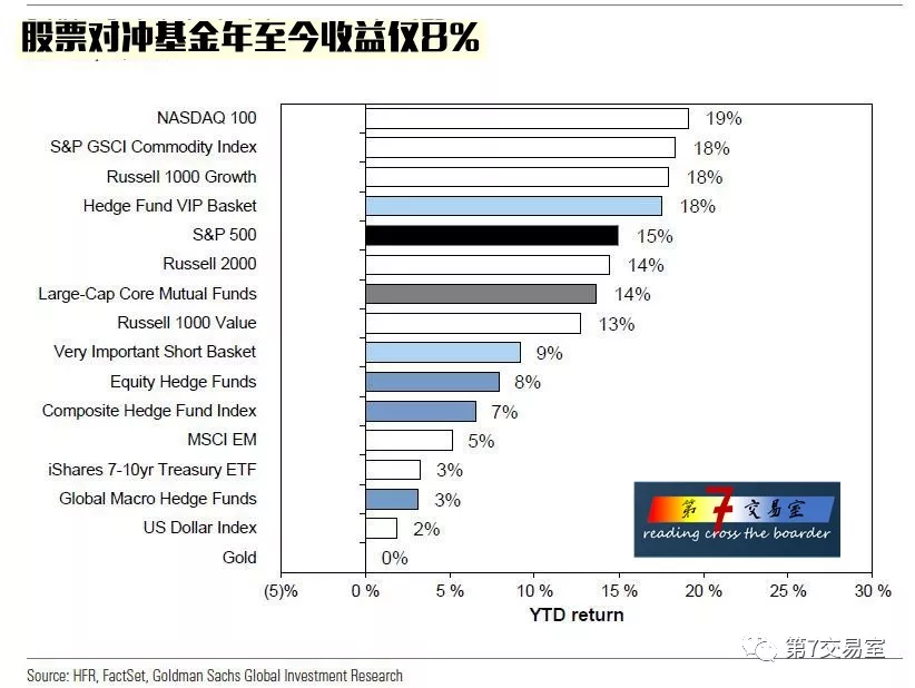 除了纳斯达克指数有一定的涨幅,包括标普,道指和罗素小盘股指数等各类股指现在都有不小的跌幅,也就是说,一年半来,美股其实是不涨反跌的。但即便是这样的成绩,大盘的年至今收益率就已经比大部分的股票对冲基金强了: