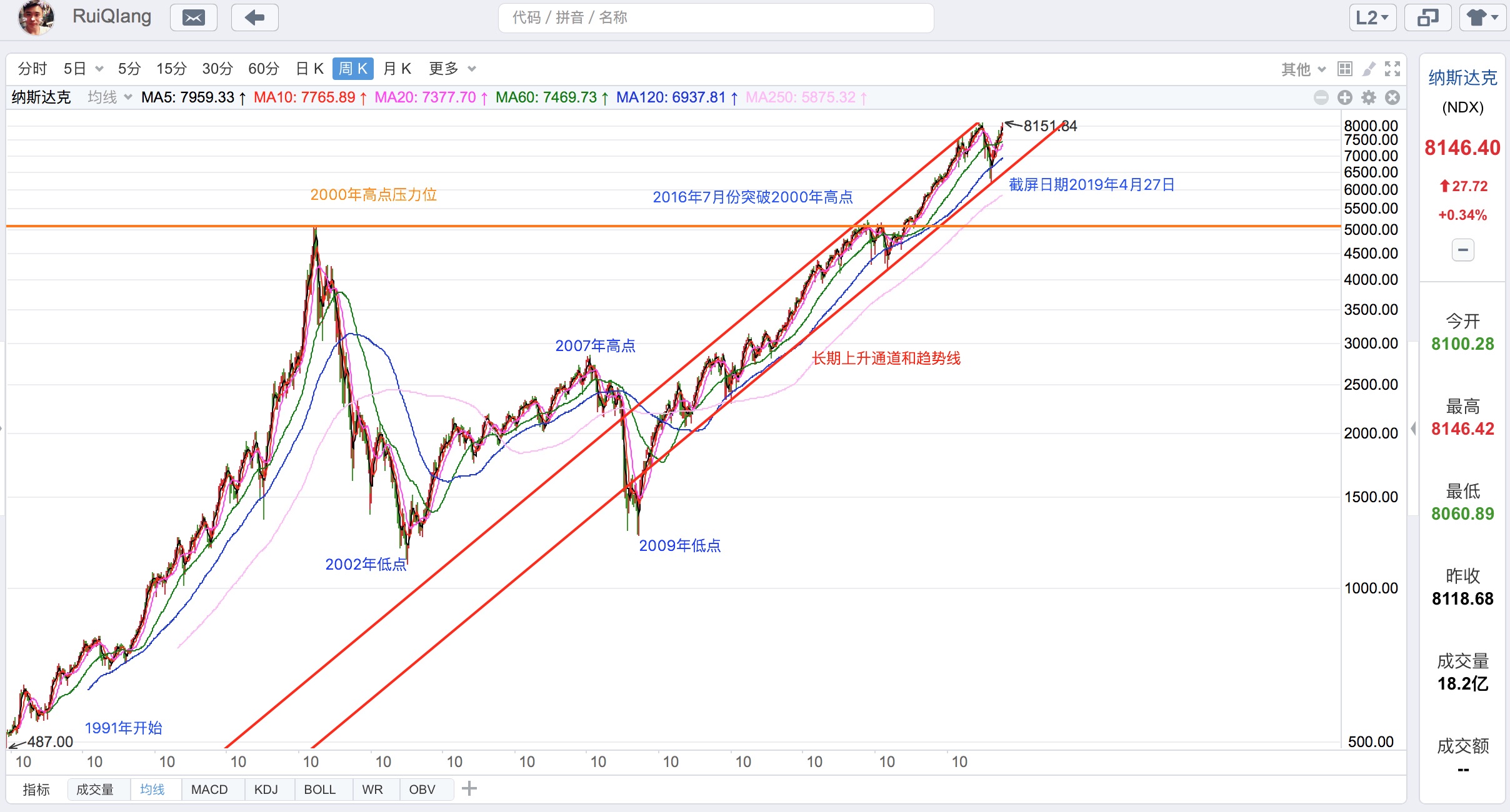 都不要再唱空美股了。这是从1991年开始到现在的周线图,指数在2016年7月份正式突破2000年的高点压力线,到现在已经快3年了。而之前回调和第一波牛市和回调的熊市经历了十几年,再加上突破2000年压力位后和2018年的回调刚好形成标准的上升通道。不管根据此前的时间周期 还是 波浪理论来讲,现在正是主升浪,而且还是启动不久的主升浪,可能还真会如特朗普所说还会继续上涨几千点。[呆住][呆住]