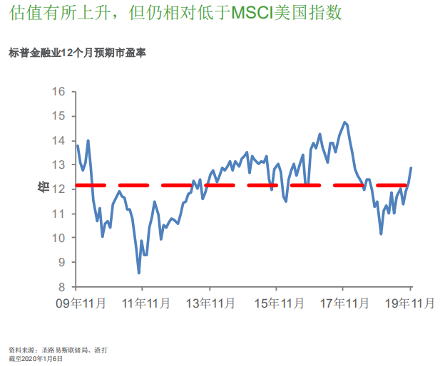 • 美国金融业估值攀升, 12个月预期市盈率为13倍,略高于长期均值12倍。