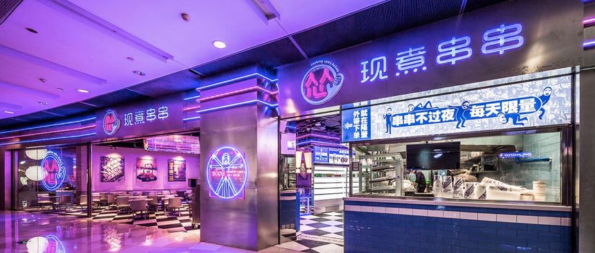 四川冷锅串串“怂”更显网红气质。“怂”定位于年轻顾客的聚会场所,装修色调张扬、醒目,颇有夜店的风格。茫茫商场中,你大概一眼就可以看到这个不太“正经”的饭馆。