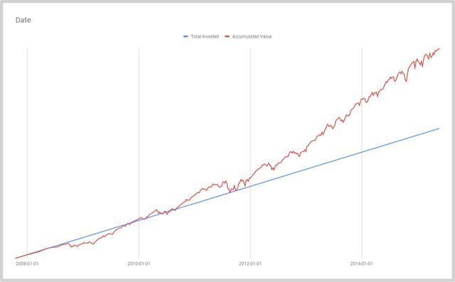 你的资产净值在相当长一段时间里落后于累计投资金额。但是,到了2009 年底,红线穿过蓝线,此后几乎就一直处于超越蓝线的状态,并且相对于蓝线的增长是越来越快。