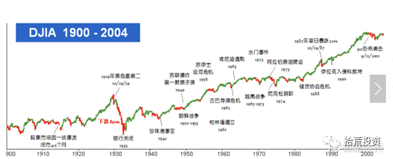 先放一张比较经典的图,美股百年以来的事件:经历过战争,经济危机,各种各样的事件。虽然短期内有一定程度的影响,但是长期来看,指数永远向上。