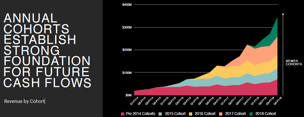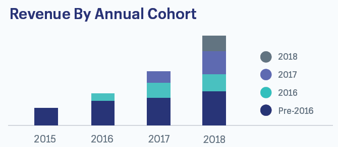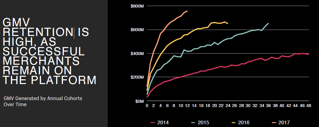 进阶到Shopify plus 的客户才能够等同于一般saas公司的客户,这样的客户稳定性强,而且Shopify还通过物流配送中心增加与客户的粘性,获得更高的服务订阅价。下面两张图会看的更直观些,尤其是14年以前的客户的营收贡献以及GMV(红色部分)