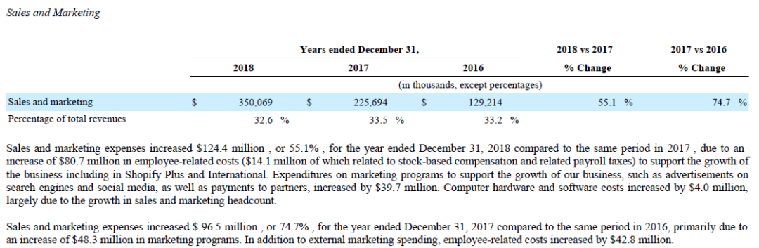 确实在某种程度上,我对于Shopify纯粹依赖于“合作伙伴”支付高额销售费用来拓展市场是有担忧的。一方面,这种佣金模式的高效销售体系的价值在账面上完全没有表现出来,是非常吸引人的一点;另外一方面,这个销售体系通过facebook广告向潜在客户推广可以通过从阿里巴巴采购然后销售来致富,这种方式带来的营收的可靠性和价值如何考量还是有待商榷的。