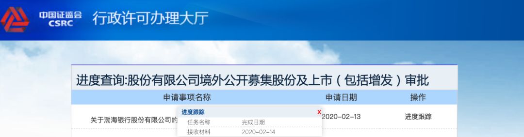 2月13日,渤海银行提交了《关于渤海银行股份有限公司境外首次公开发行股份(包括普通股、优先股等各类股票及股票的派生形式)审批》材料。次日获得证监会接收。