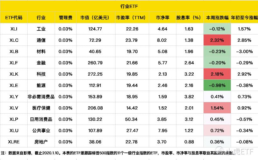 净流出排行方面,标普500ETF($标普500ETF(SPY)$ ),20年国债ETF($债券20+美公债指数ETF-iShares Barcla(TLT)$ TLT)和黄金ETF($SPDR黄金ETF(GLD)$ )上榜。本周三大股指继续上涨,有七个行业取得正收益。其中涨幅最大的是通信XLC和科技板块$高科技指数ETF-SPDR(XLK)$ XLK,分别为2.32%和2.18%,通信板块得益脸书和谷歌的强劲涨幅,XLK则是受益于互联网企业。XLE能源板块略回调,跌幅为0.98%,受累于原油。