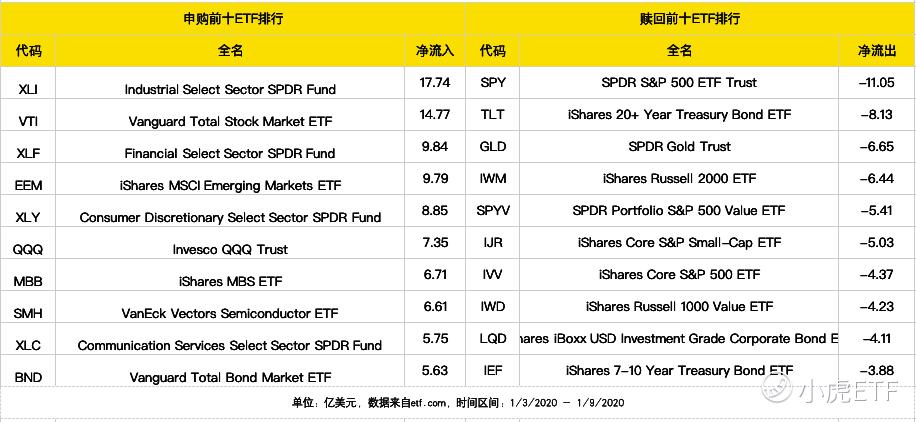 进入2020年,投资者对ETF市场的热情可是一点都没有退却,在去年录得3263亿美元的净流入之后,ETF市场在今年短短几天就获得了151亿美元的净流入,目前年初至今(2020.1.2-2020.1.9)净流入达到了217亿美元,在2019年同期ETF市场只有127亿美元的净流入,我们可以看到投资者对ETF这种投资工具的喜爱是逐年增长。$老虎中美互联网巨头ETF(TTTN)$