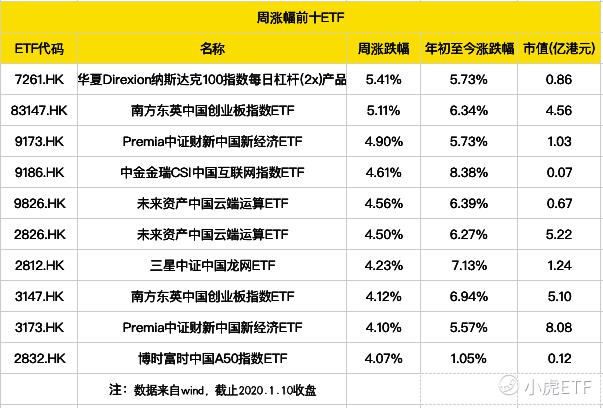 本周香港上市ETF华夏Direxion纳斯达克100指数每日杠杆(2x)产品的涨幅最大,为5.73%。除去杠杆产品,中国创业板在本周的涨幅是投资者有目共睹的,因此投资中国互联网科技行业的ETF都纷纷上榜。。