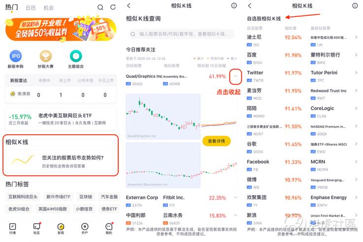 2)发现页面,新增相似K线根据相似K线判断个股未来走势,还能看你自选股的相似股票。