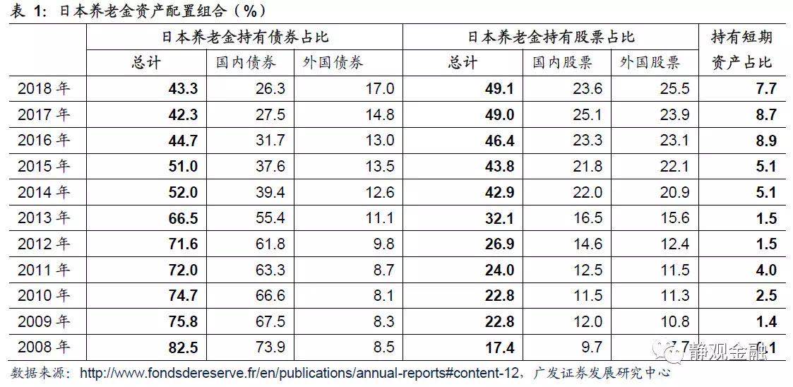 根据广发证券的统计,日本养老金在2008年之前主要是持有日本的国债。2008年的养老金配置组合中,购买国债的比例高达82.5%(其中73.9%是购买的日本本国的债权)。经过十年的变化,资产配置中的债权比例从82.5%降至43.3%(还剩一半)老龄化的发展各种开支越来越多,日本面向国债利率为0的发展(全球都负利率债券),国内购买日本债权的比例也从73.9%降至26.3%(到期不再买),而是选择购买外国的国债(主要是美债)。另外,最值得注意的就是日本养老金近十多年的变化中,他们将大部分养老金拿去做股票:股票在养老金的占比从2008年的17.4%升至2018年的49.1%(2008年日本养老金投资国外股票占比8.7%),十年后却是增至25.5%(增高了3倍)。