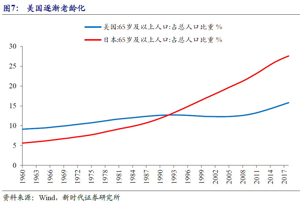 根据新时代证券的统计,美国、日本的老龄化在他们国家的占比是很高。1960年到2018年的时间,尤其是近十年到十五年时间,美国和日本65周岁以上人口占比斜率骤增。也就是说近十年,尤其是在零八年次贷危机之后,到现在12年左右的时间。