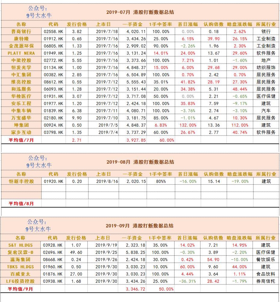 同比去年9月有15只新股,今年仅有6只新股,受香港大环境的影响,数量方面减少了一半,去年涨幅较大的港亚控股和WAC Holdings分别涨幅达到150%和77.5%,今年TBKS HLDGS延续了字母股的神话,首日大涨60%,从S&T HLDGS开始暖场香港新股市场,延续去年的“红9月”,另外,回顾一下去年10月打新数据,盈亏比也相当优秀,SO,10月本人会积极参与打新。