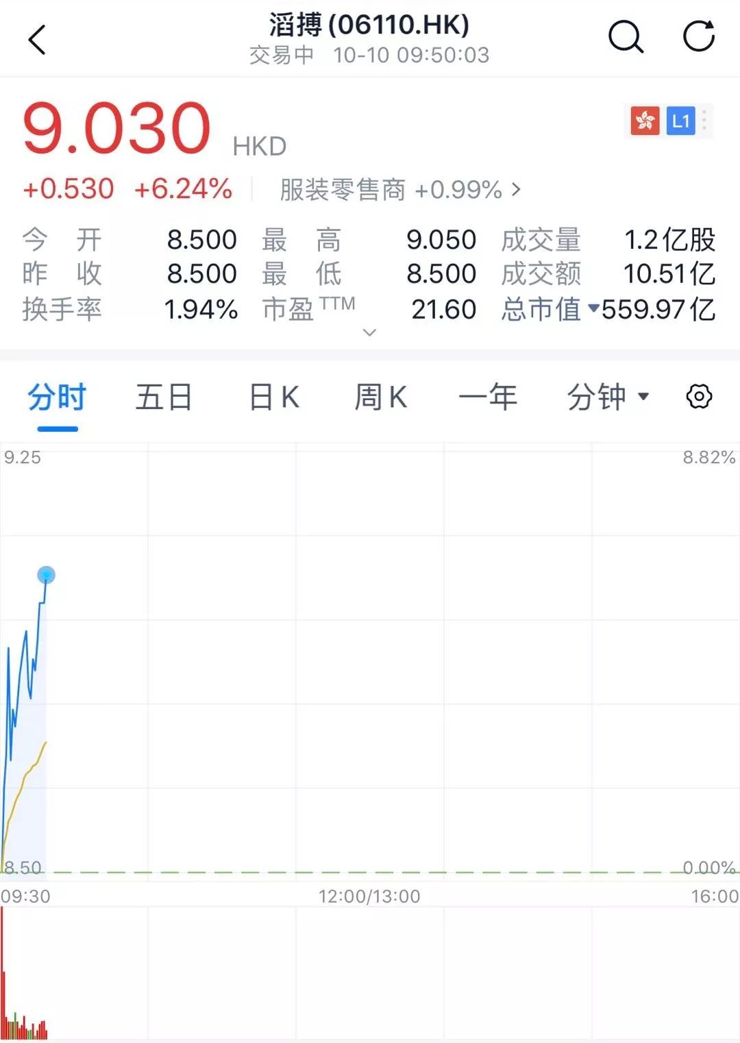 截止发稿时,滔搏国际拉升超6%,报9.03港元/股,市值超过559亿港元。