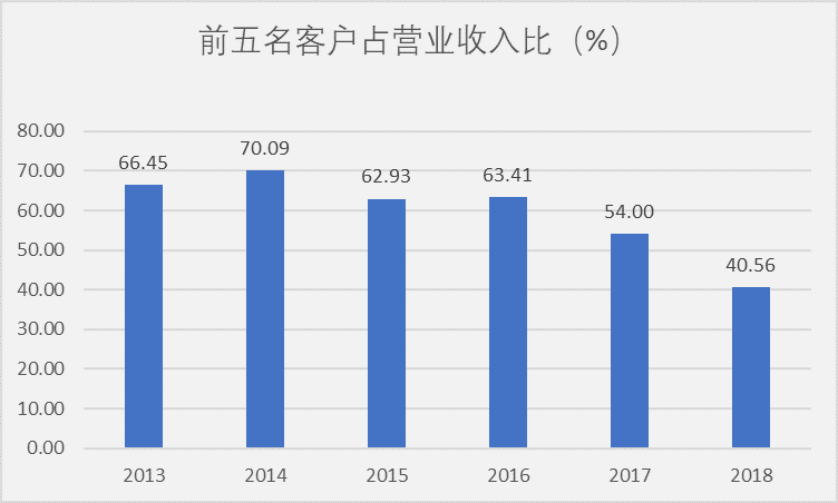 在公司大力开拓业务下,公司过度依赖大客户的现象也已经得到了较大的改观,公司前五大客户占比从2013年的66.45%降至2018年的40.56%。