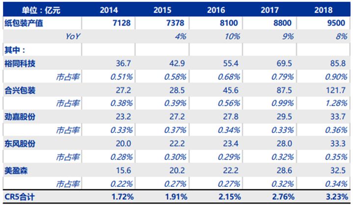 现如今,伴随行业落后产能的淘汰,和龙头的持续收购整合,包括裕同科技收购武汉艾特、上海嘉艺,合兴包装收购合众创亚等等,行业集中度明显提升。根据2018年纸包装行业产值约9500亿元计算,目前纸包装上市公司中CR5已从2014年的1.7%接近翻倍至3.2%。