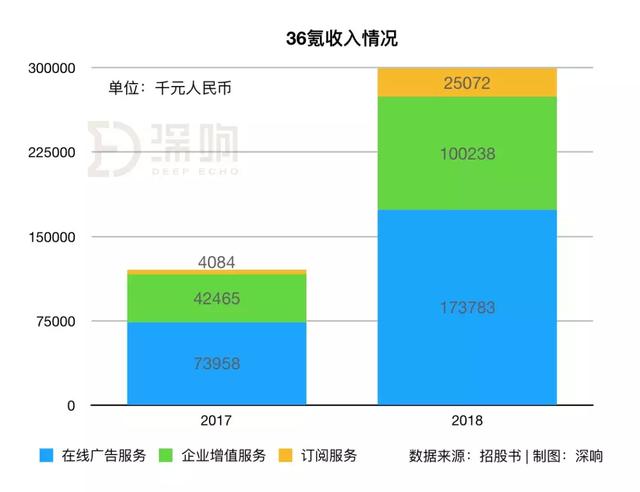 财务数据上,36氪在2018年取得营业收入2.99亿元人民币,相比较2018年的1.21亿元增长148%,其中线上广告业务收入为1.74亿元人民币,企业增值服务收入1亿元人民币,订阅服务收入2507万元人民币。
