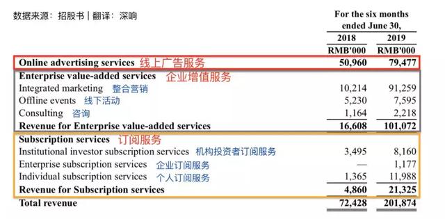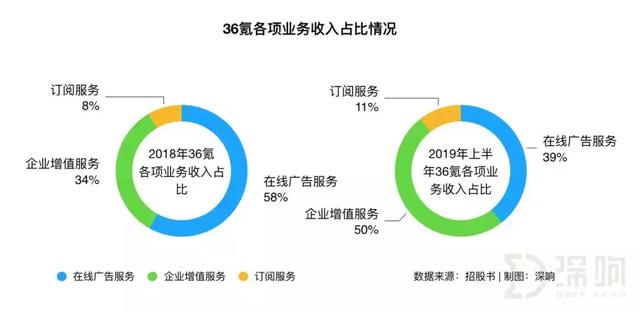 2019年上半年,36氪线上广告服务收入为7947.7万;企业增值服务收入约为1.01亿,其中整合营销业务收入9125.9万、线下活动收入759.5万、咨询服务收入221.8万;订阅服务收入2132.5万,其中机构投资者订阅收入816万、企业订阅收入117.7万、个人订阅收入1198.8万。