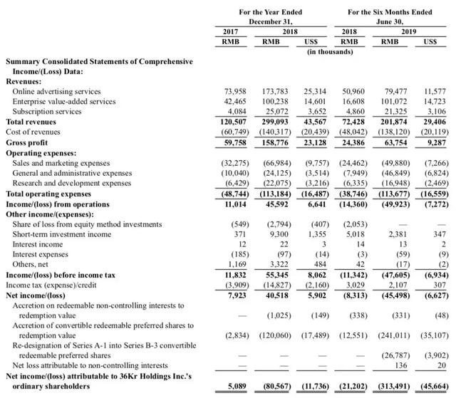 招股书显示,36氪在2018年营收2.99亿元人民币,净利润4051.8万元。
