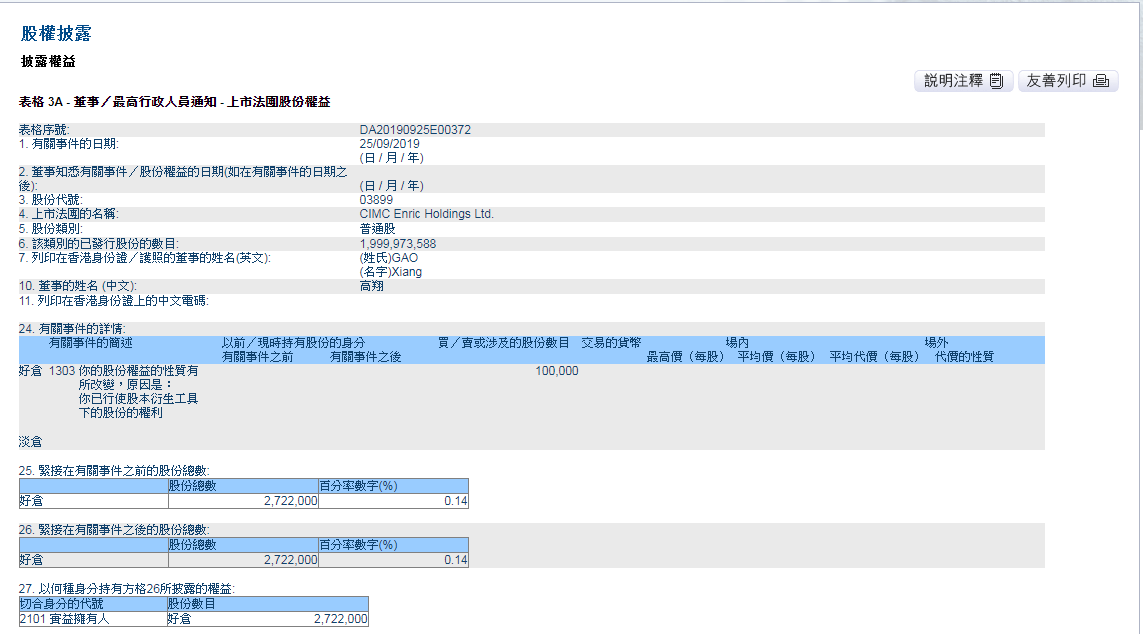 据中集安瑞科于港交所的股权披露信息显示,中集安瑞科董事长高翔于2019年9月25日透过行使10万股购股权籍此购买了10万股中集安瑞科股票。购买股权后,高翔股权持有量及相关股份权益共达272.2万股。