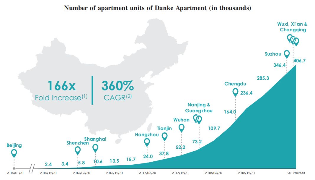 招股书数据显示,2015年底蛋壳公寓有2434间公寓单元,且全部位于北京;截至2019年9月30日,蛋壳公寓已进入北京、深圳、上海、杭州、天津、武汉、南京、广州、成都、苏州、无锡、西安、重庆13地市场,共运营406746间房间,房间数增长了166倍,2015年底至2018年底三年年复合增长率达360%。
