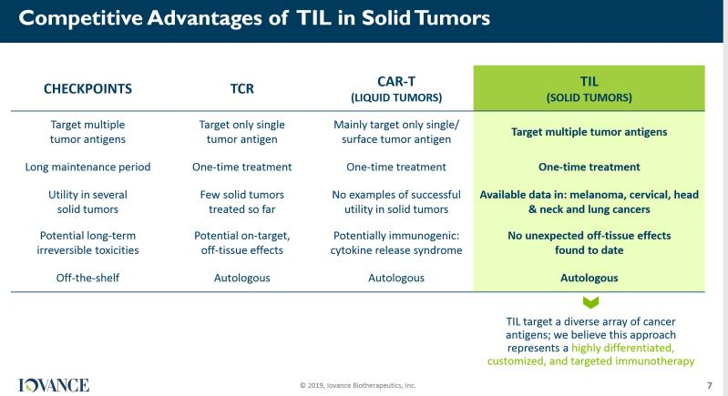$Iovance Biotherapeutics, Inc.(IOVA)$ 目前在TIL技术上取得了不错的成绩。这个技术是一种被动免疫疗法,可以体外培养和激活大量的T细胞,适用多种肿瘤抗原。所以IOVA在TIL技术上的领先会使该公司的产品适用范围更广,从而增加了药品研发成功的概率。