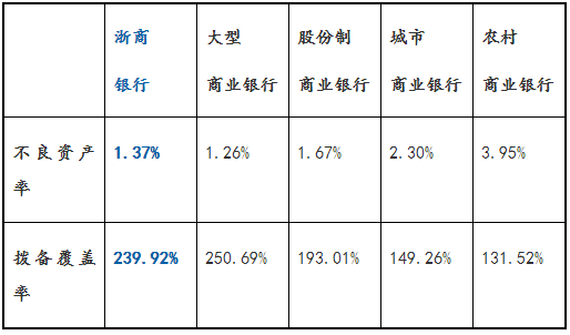 作为12家全国性股份制商业银行之一的浙商银行,在其不良资产率比股份制商业银行平均水平低0.3个百分点的情况下,拨备覆盖率还要高出平均水平近48个百分点。