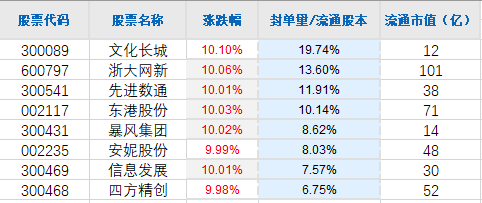 看看今天涨停封单量 / 流通股本最大的几只股票: