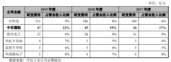 从研发费用和收入比例来看,中芯国际在全球所有晶圆代工厂中占比营收最高。按2019年数据计算,台积电的研发费用为211亿元人民币,占总收入的9%;中芯国际的研发费用为47亿元人民币,占总收入的22%。