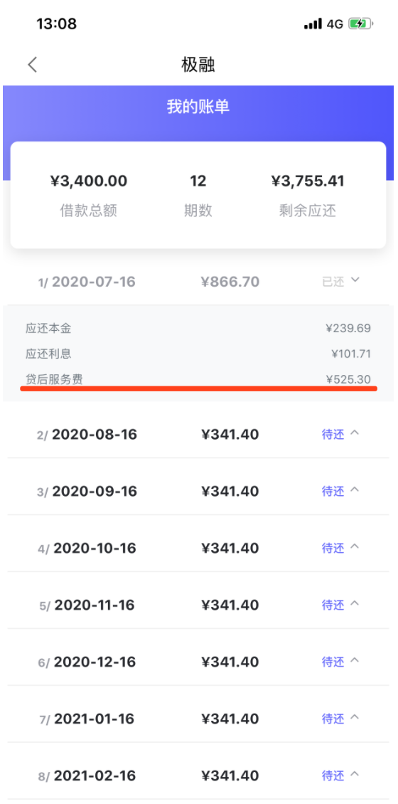 但根据还款账单内显示,在第一期还款中需还款866.7元,其中包括525.3元的“贷后服务费”,剩下期数还款金额为341.4元。
