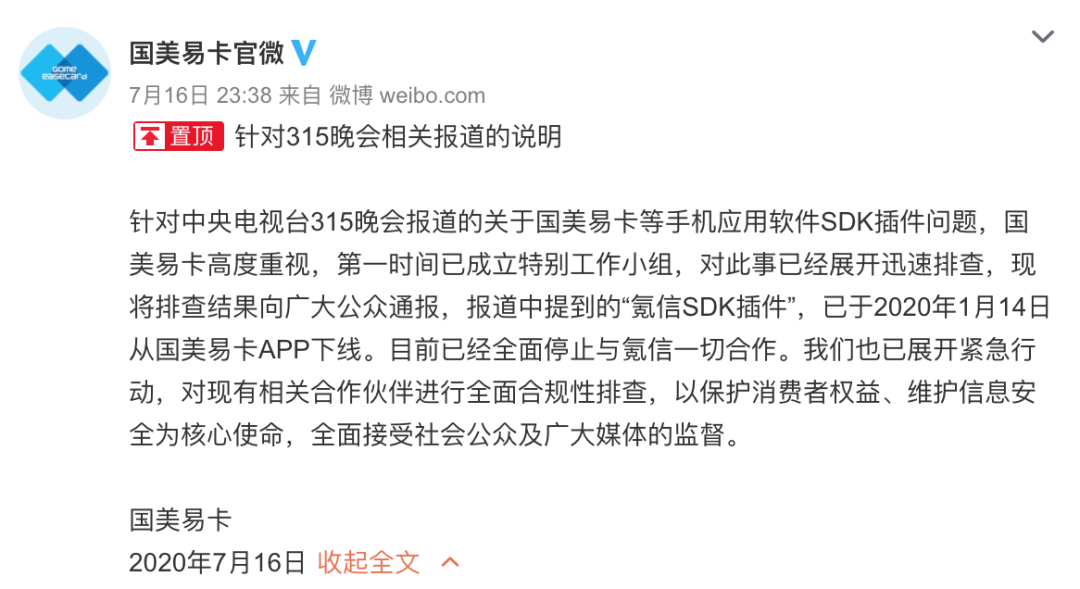 曝光内容为,多款网贷App产品存在盗取用户信息,致使用户有可能遭受经济损失的隐患。其中被点名产品包括:国美易卡、麦芽贷、乐享宝、小当家等多款App。