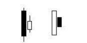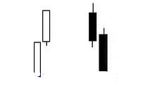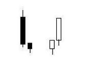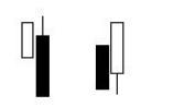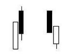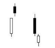 3、左图一阳加上一根跳空的阴,说明空方力量正在增强。若出现在高价位,说明空方有能力阻止币价继续上升。若出现在上涨途中,说明空方的力量还是不够,多方将进一步创新高。右图与左图完全相反。多空双方中多方在低价位取得了一定优势,改变了前一天的空方优势的局面。今后的情况还要由是在下跌行情的途中,还是在低价位而定。