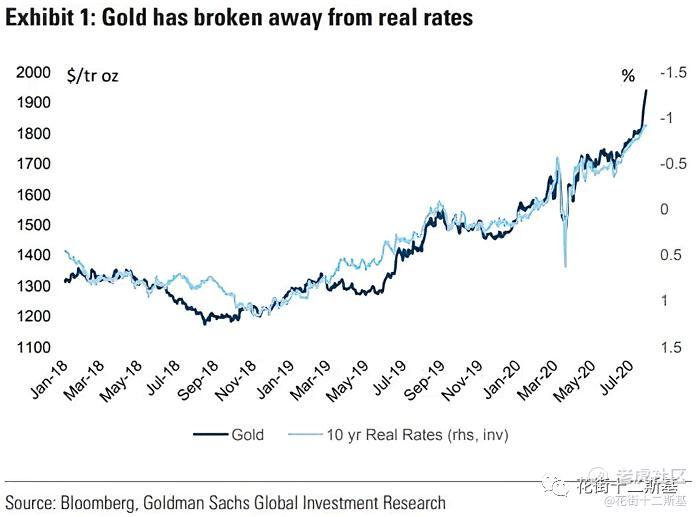 高盛的图,以往黄金跟实际利率变化关系紧密,不过经过最近一波上涨,10年期实际利率被黄金远远甩在后面。。。