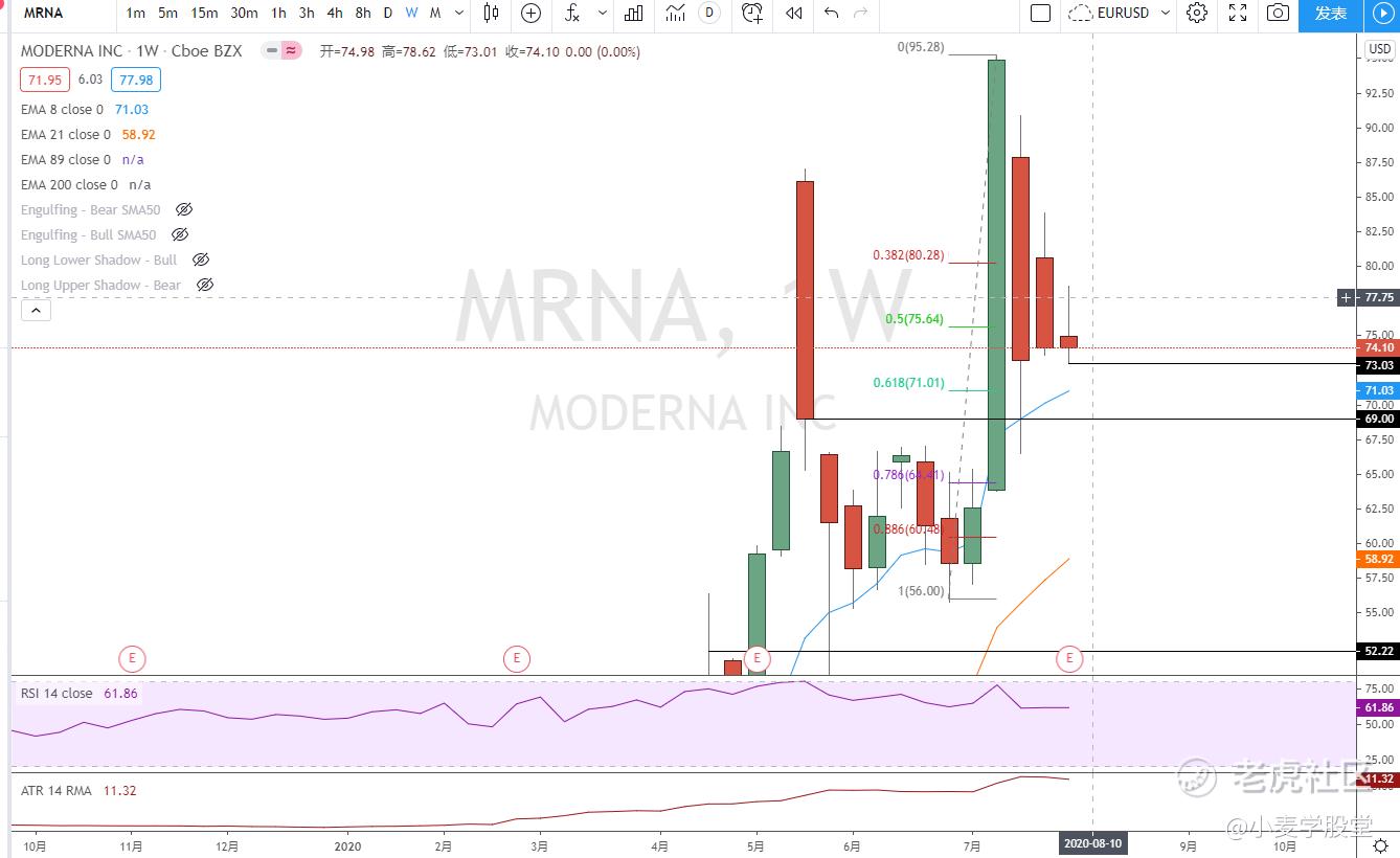 持仓的MRNA,周线孕线下破。我最不想看的出现了。止损直接73,跌破就走了。69下方再考虑接回来。