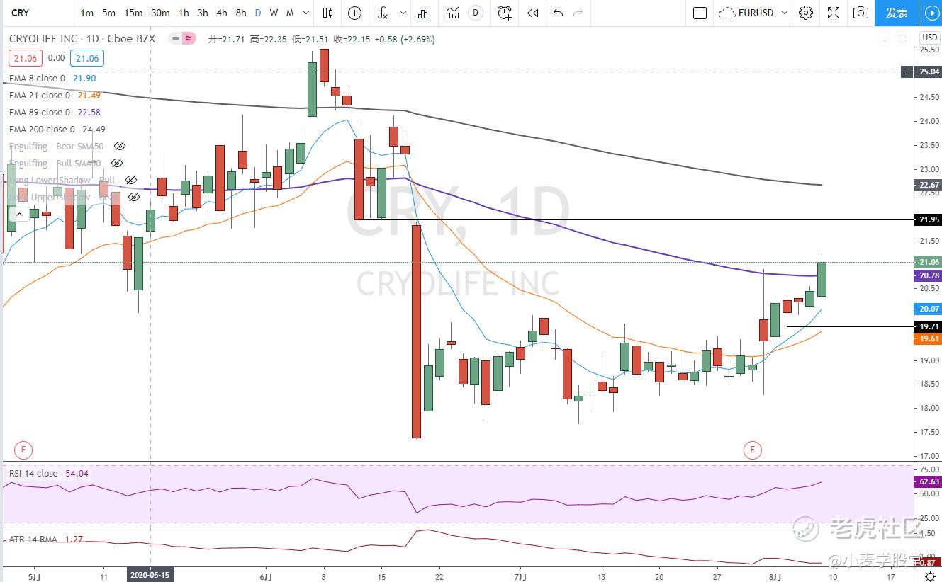 今天开买了一只股票CRY 。 在开盘的时候冲进去了。由于双孕线突破后,第三根测试了跌不破,今天开盘不考虑就进去了。止损在19.7。