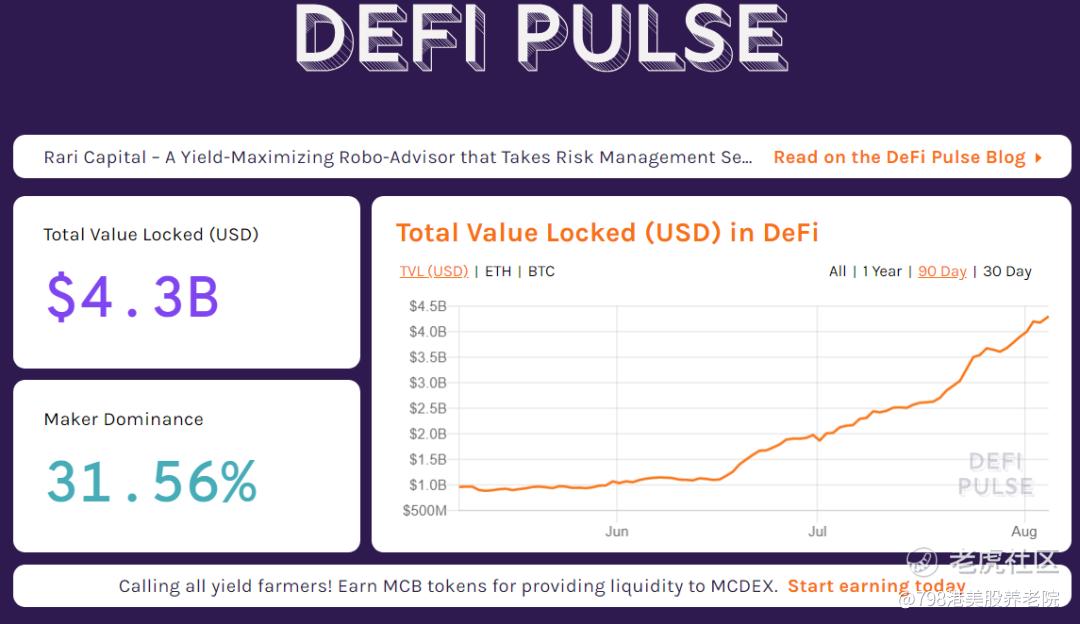 根据Defi Pluse 数据,最近90天DeFi生态抵押市值直线上升,现在(8月4日)已经超过43亿美元。
