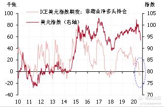 从历史经验看:看多或看空美元的交易非常拥挤的时候,表明美元指数非常接近顶部或底部了。