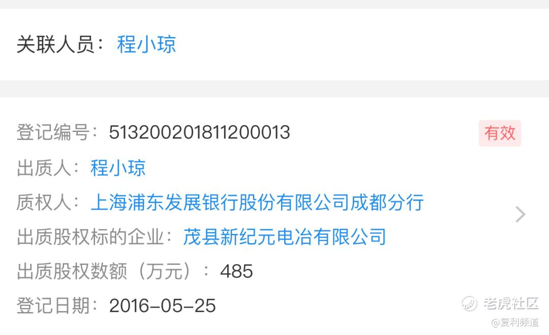 复利频道发现,程女士在2015年5月,通过茂县新纪元电冶有限公司质押485万元股权,而质权人正是浦发银行成都分行。