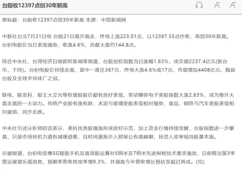 本来想就此推送本文的,结果我刚才看了看新闻:我国台湾地区股市也创30年新高了,真不容易,我国A股的上证指数明天也要正式落地。