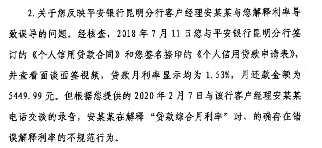 云南银保监局针对平安银行昆明分行此问题做出回复:客户经理在解释“贷款综合月利率”时,的确存在错误解释利率的不规范行为。