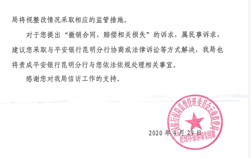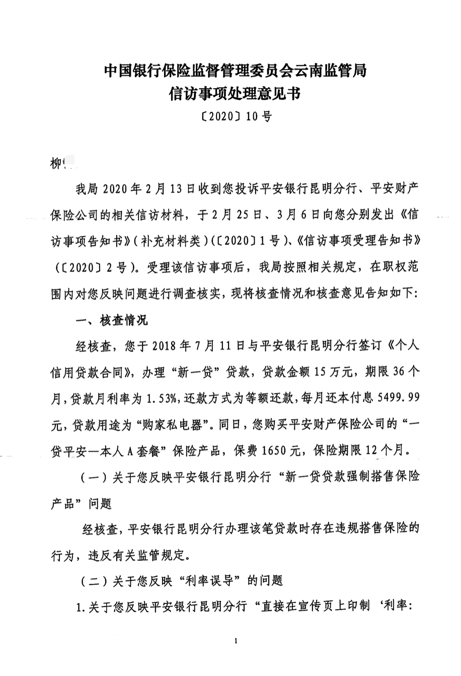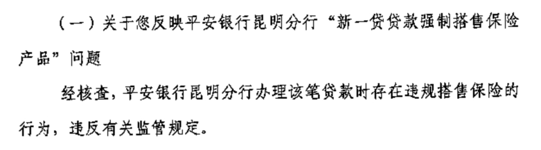 云南银保监局回复柳女士:经核查,平安银行昆明分行办理该笔贷款时存在违规搭售保险的行为,违反有关监管规定。