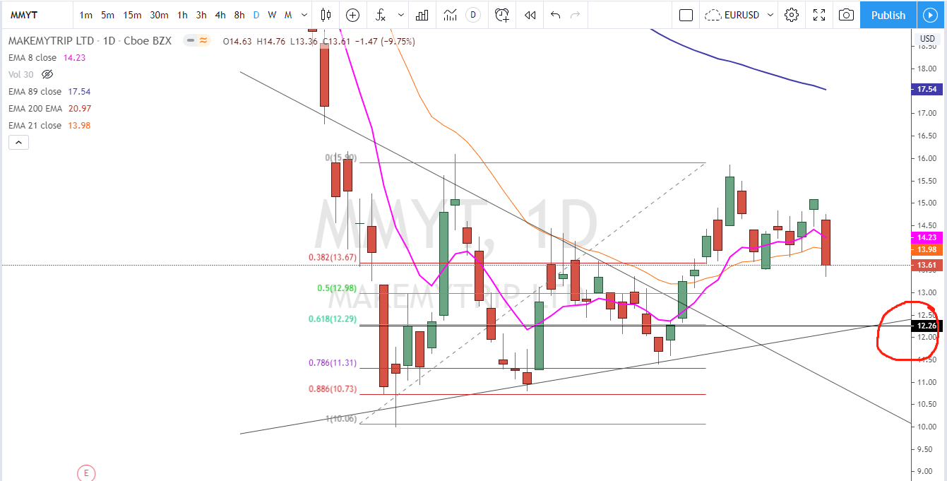 5. MMYT三角形盘整后网上突破回踩,12.26以下这个位置可以考虑,止损在10。$MakeMyTrip Limited(MMYT)$