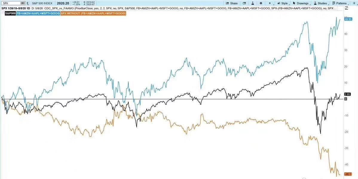 3. 软件股强势撑盘,亚马逊、Netflix均有较好表现,有趣的是我从在图中看到,标普500其实是在FAAMG上涨的。没有了这5只股票,大盘还是继续往下走。