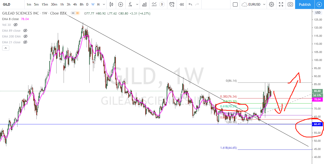 4. 今天新增了三只关注的股票,GILD是生产瑞德西韦的公司,从月线可以看出已经突破了三角型上方的压力线了,只需要等待回踩70块以下也是就0.618位置就可以进场。止损60块。$吉利德科学(GILD)$