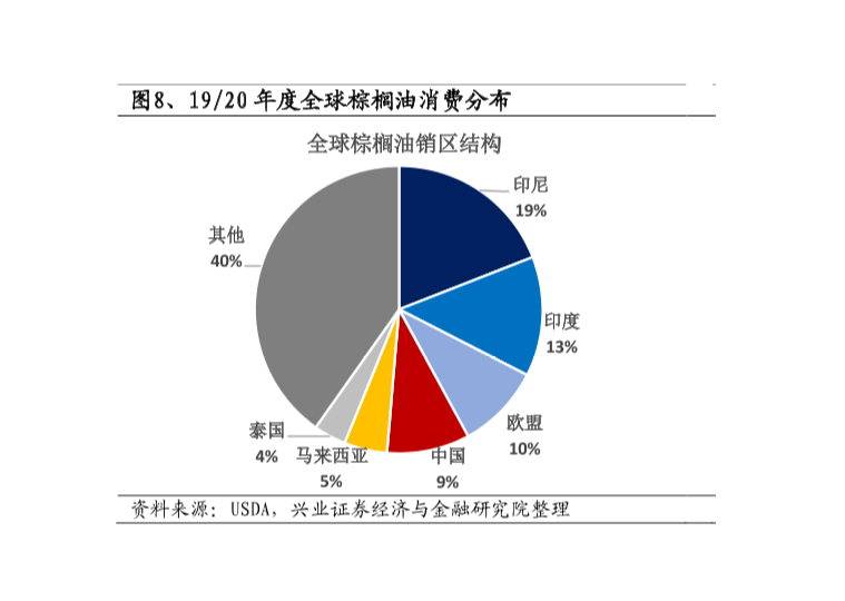 但是自21世纪以来,发展中国家的强劲需求一直是推动全球棕榈油产量的主要因素。例如,印度作为食用油消费主要国家之一,其因庞大的人口基数以及传统的油脂消费需求支撑,成为了全球第一大棕榈油进口消费国。2019年印度全球棕榈油消费占比为13%。此外,由于我国也是食用油消费大国,因此在棕榈油消费也占到全球的9%。